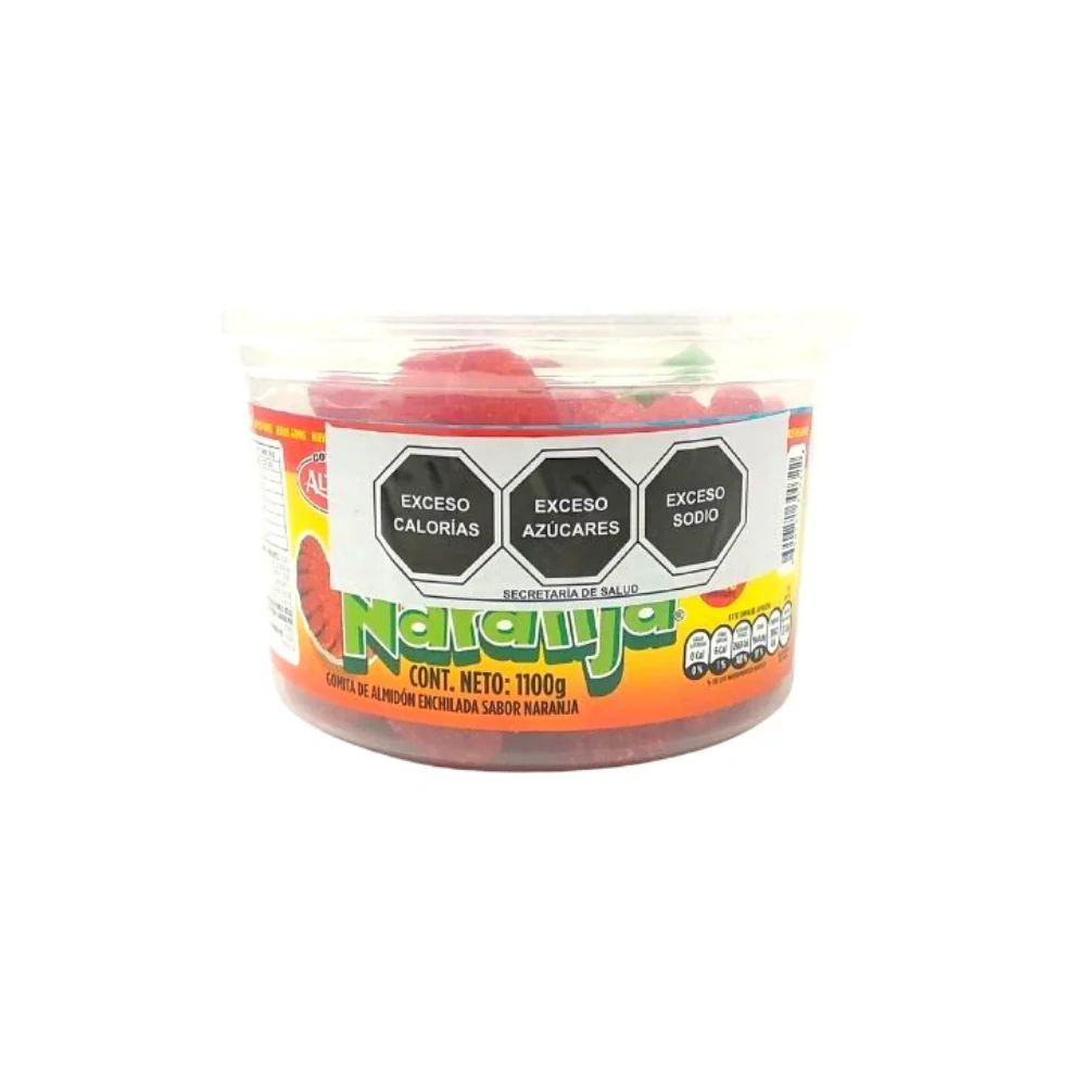 Deliciosas gomitas de almidón enchilada con sabor a naranja. Agrega su rico sabor a tus bolsitas de dulces.