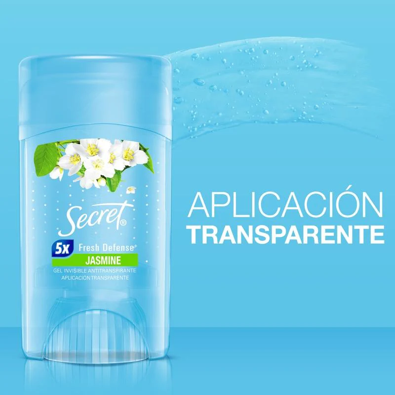 LONG DESCRIPTION:El desodorante antitranspirante en Gel Jasmine de Secret tiene un suave aroma a Jazmín fresco. Con aplicación transparente, te ofrece protección contra el sudor y el mal olor, sin dejar manchas blancas en la aplicación. Siéntete protegida y fresca todo el día.Fácil de usar, se aplica directamente en la piel. Quita el sello de seguridad, usa 2-3 clicks por axila, aplica diariamente solo en las axilas, y mantén el envase bien cerrado.SHORT DESCRIPTION:El desodorante antitranspirante en Gel Jasmine de Secret tiene un suave aroma a Jazmín fresco. Con aplicación transparente, te ofrece protección contra el sudor y el mal olor, sin dejar manchas blancas en la aplicación. Siéntete protegida y fresca todo el día.