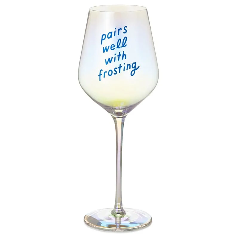 ¡Ten tu pastel, y también tu glaseado y vino! Esta copa de vino con tallo de 20 onzas y diseño iridiscente presenta una frase divertida para tus golosos favoritos. Es el regalo de cumpleaños perfecto para un amante del vino.