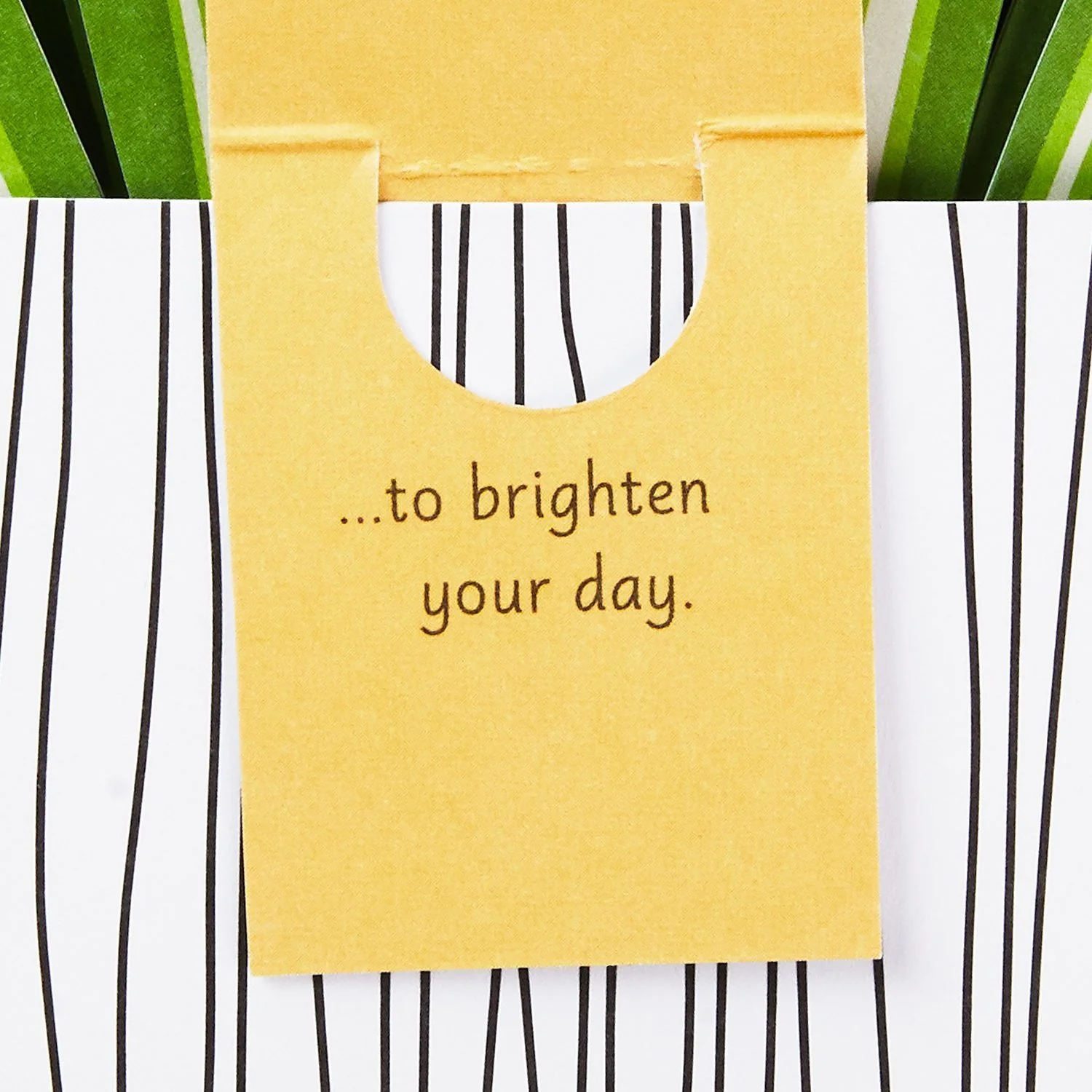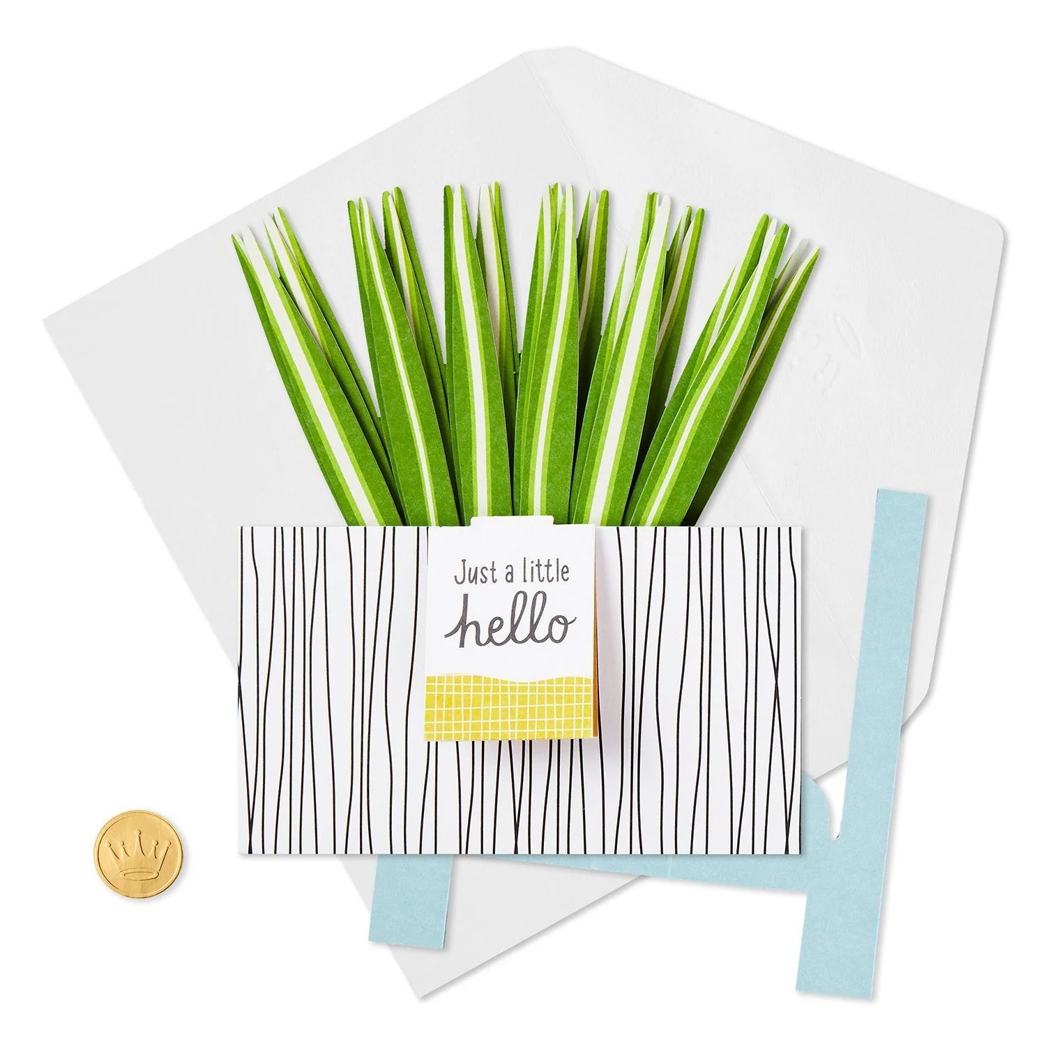 La tarjeta de felicitación Hello presenta una planta araña tridimensional cortada con láser en una maceta redonda diseñada y un soporte. La planta de artesanía en papel 3D es perfecta para exhibir en cualquier lugar donde necesite un poco de alegría: excelente para enviar deseos de mejora, una nota pensando en ti, aliento o simplemente porque sí. Simplemente abra la tarjeta para revelar la sorpresa emergente en el interior; no requiere ensamblaje. La etiqueta colgante perforada con mensaje se puede quitar y guardar como recuerdo, mientras que esta tarjeta única es una pieza de decoración divertida durante todo el año. Un juego de palabras especial en la parte inferior de la maceta seguramente hará sonreír al destinatario. Cuando se abre para su exhibición, la tarjeta emergente 3D mide aprox. 9,25″ de alto.