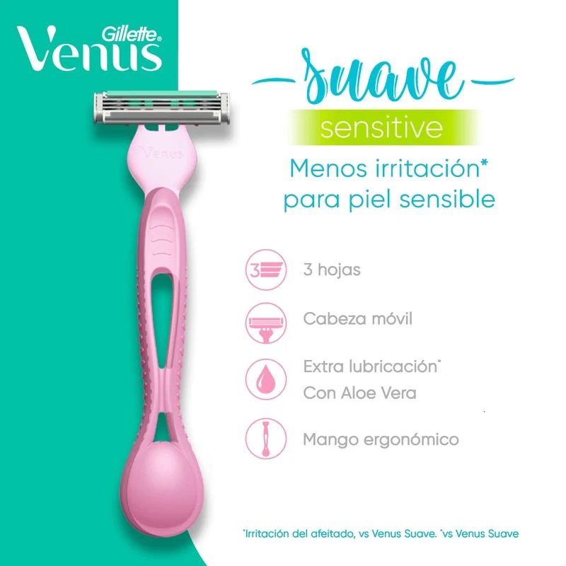 La máquina de afeitar para mujer Gillette Venus Sensitive, dermatologicamente probada para piel sensible, te da una depilación corporal al ras en una sola pasada. Cuenta con tres (3) hojas rodeadas de dos suaves almohadillas que protegen tu piel y una cabeza móvil que te ayudará a llegar a las áreas difíciles de depilar. Su banda extra lubricante con un toque de aloe facilita el deslizamiento de las hojas de afeitar en el cuerpo y además reduce la irritación del afeitado. El mango de la máquina de afeitar desechable Venus Sensitive esta diseñado para tener un mayor control mientras te afeitas. Para mejorar tu ritual de afeitado, usala con la Crema de Afeitar de Gillette Venus.