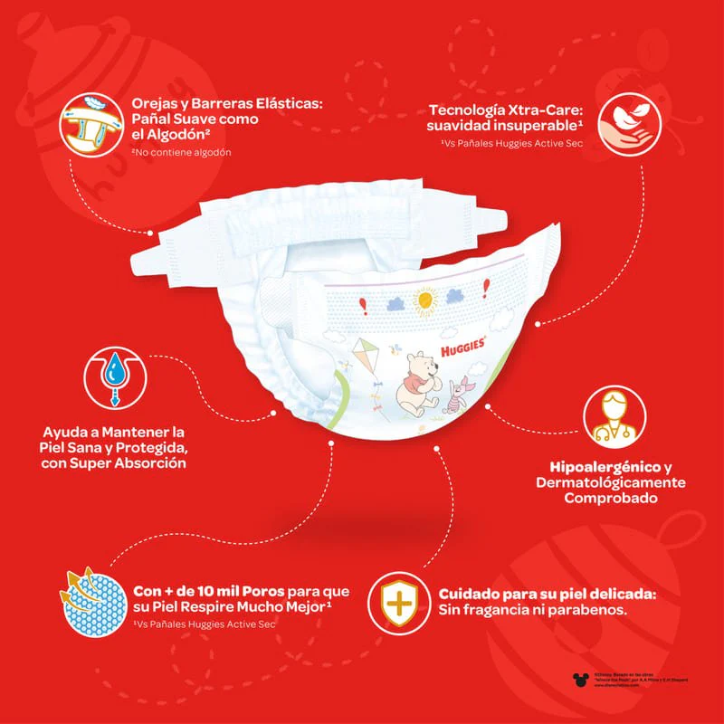 Huggies Cuidado Puro y Natural con tecnología Xtra-Care. La máxima proteción para el cuidado de la piel de tu bebé.
